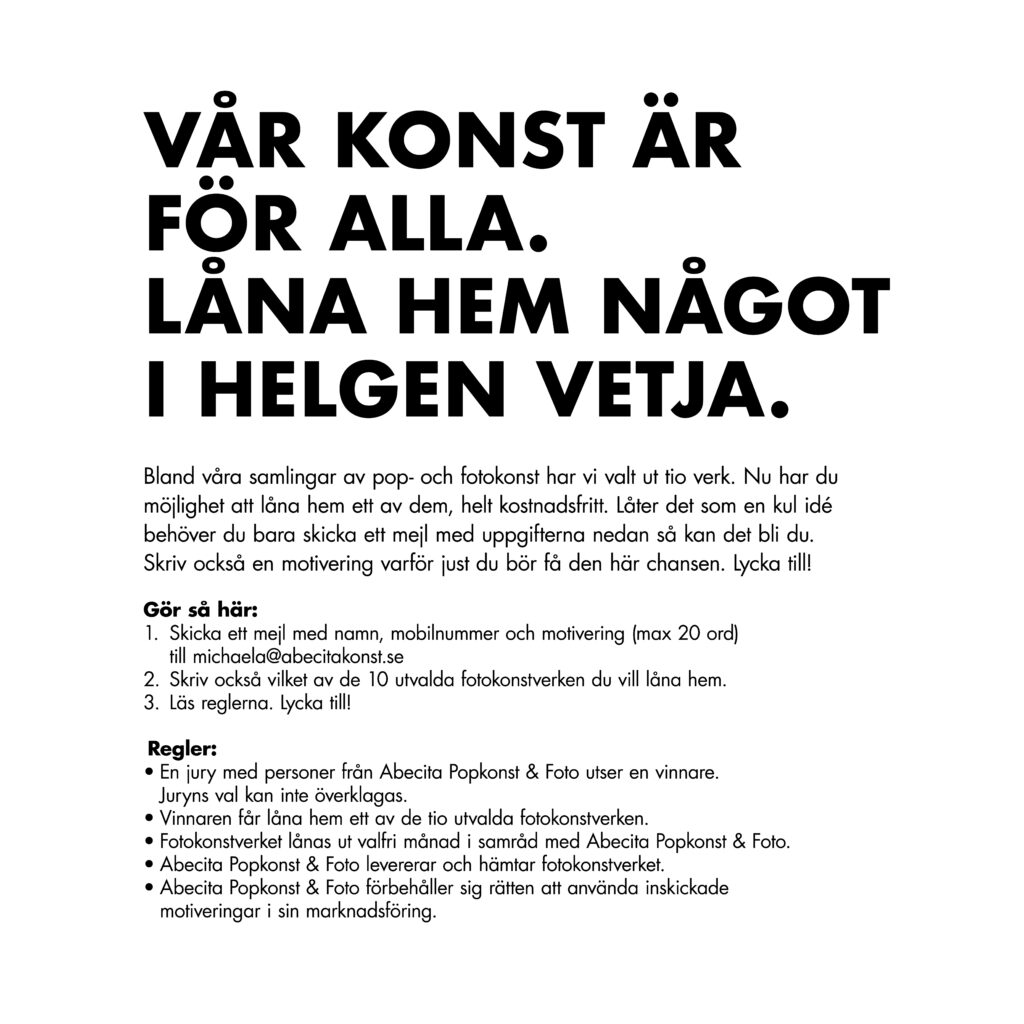 Vi valde ut ett antal äkta konstverk från Abecita Popkonst & Fotos samling. Därefter utlyste vi en tävling i olika kanaler där det gick att vinna sitt favoritverk. Vinnaren kunde sedan njuta av verket i sitt eget hem under fyra veckor.